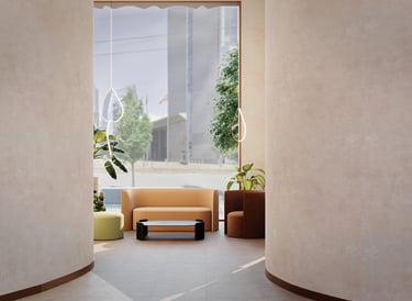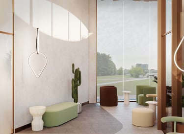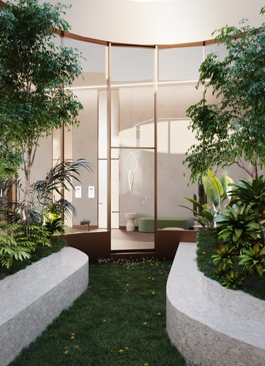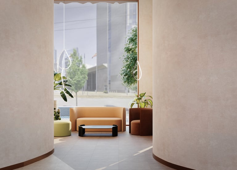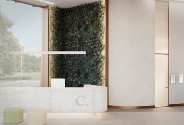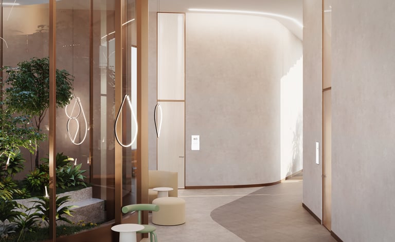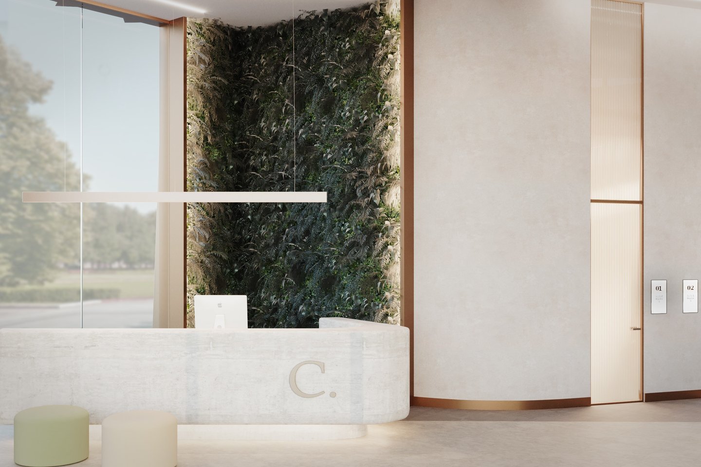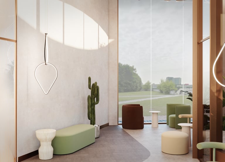 PROJECT FOR FUTURE CLINIC DESIGN CONTEST. URBAN ENVIRONMENT AND BUILDING WITH THE GARDEN IN THE MIDDLE OF IT. NATURAL AND EARTHY TONES, MINIMAL AESTHETIC AND SOME MID CENTURY STYLE ACCENTS.